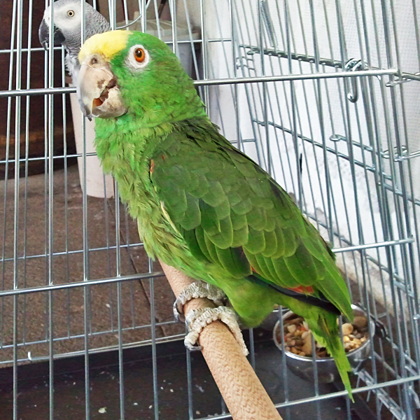 En el momento del ingreso en la Fundación Neotrópico se encontraba demacrado y con bajo peso, con crecimiento excesivo de pico y uñas como consecuencia de una alimentación inapropiada y malas condiciones de cautividad. El estado del plumaje era regular. El animal presentaba además el ojo izquierdo enucleado (tuerto).